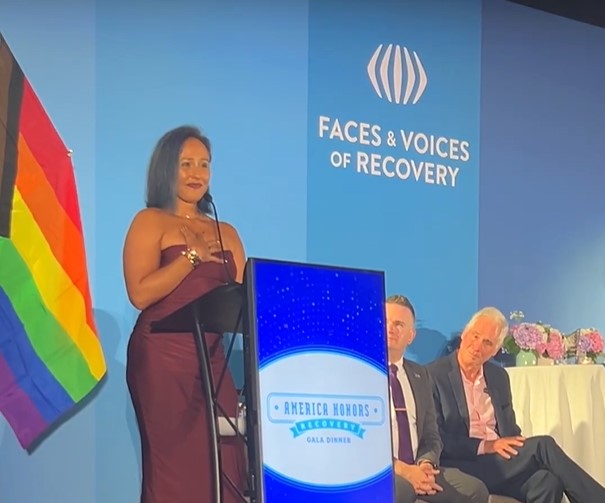 Tara Moreno-Wallen accepting the Advocate of the Year award at the Faces and Voices Leadership Summit Gala Dinner.